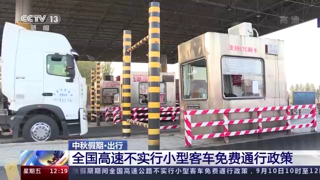 公路方面,中秋假期期间全国高速公路不实行小型客车免费通行政策。中短途自驾出行将显著增加,城市、景区周边道路将会出现区域性交通拥堵。9月10日10时至12时为出行高峰时段,9月12日16时至19时为返程高峰时段。